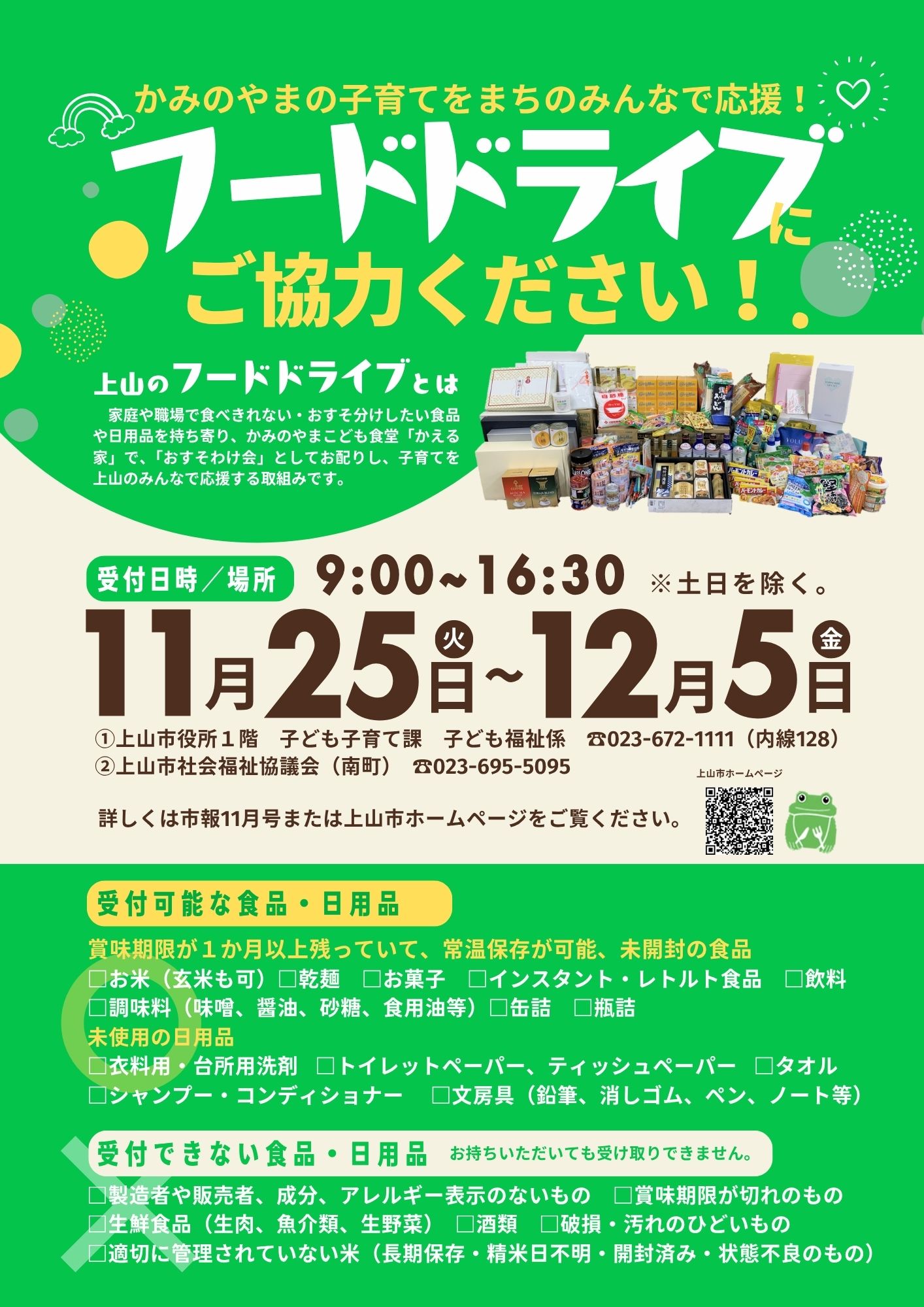 安全に食べられるのに包装の破損や規格外等の理由で流通に出せない、賞味期限が近いといった食料品などがありましたらお持ちください。もちろん、上山のこどもたちに「ぜひ!食べてほしい」という食料品についても大歓迎です。